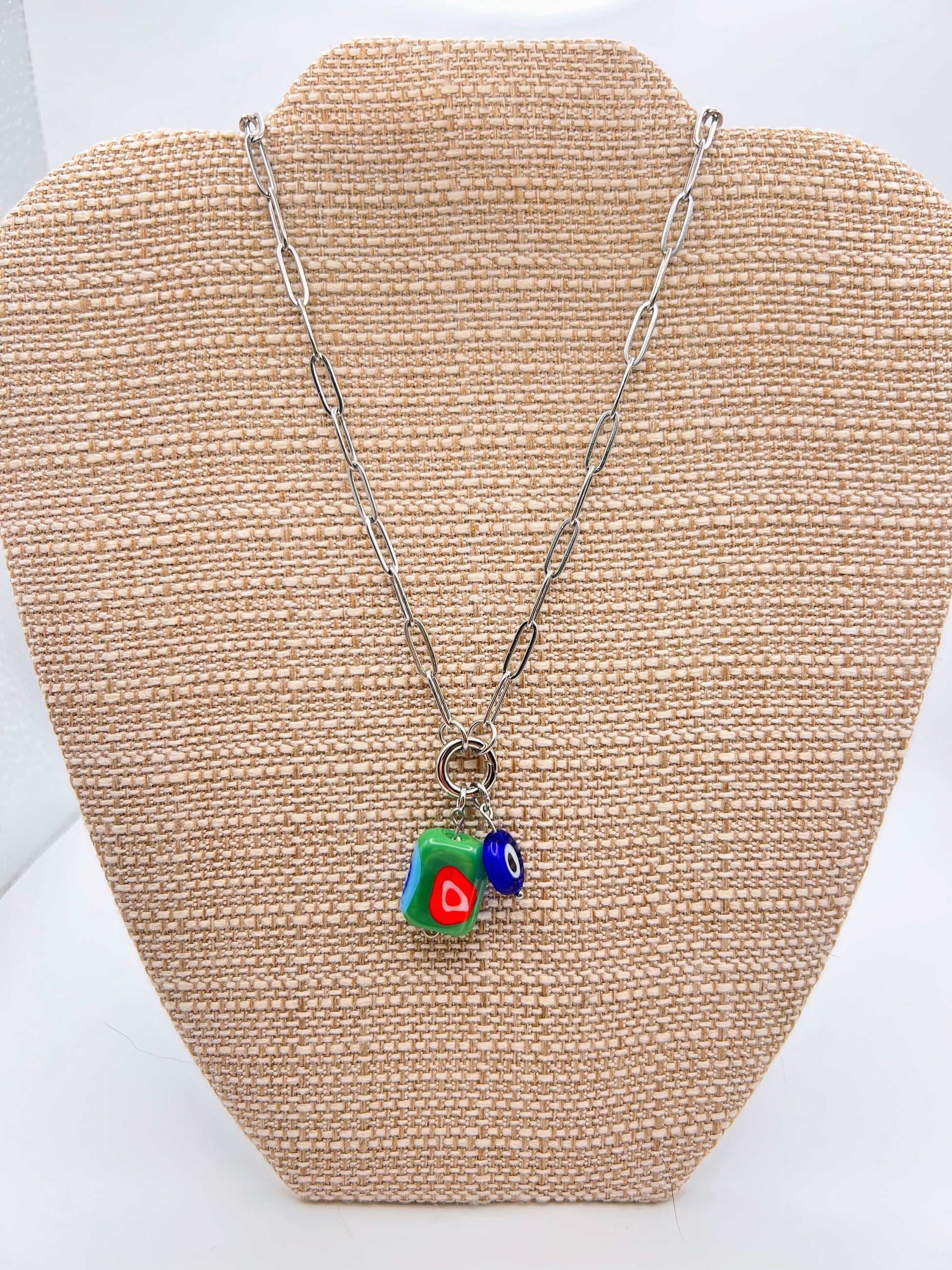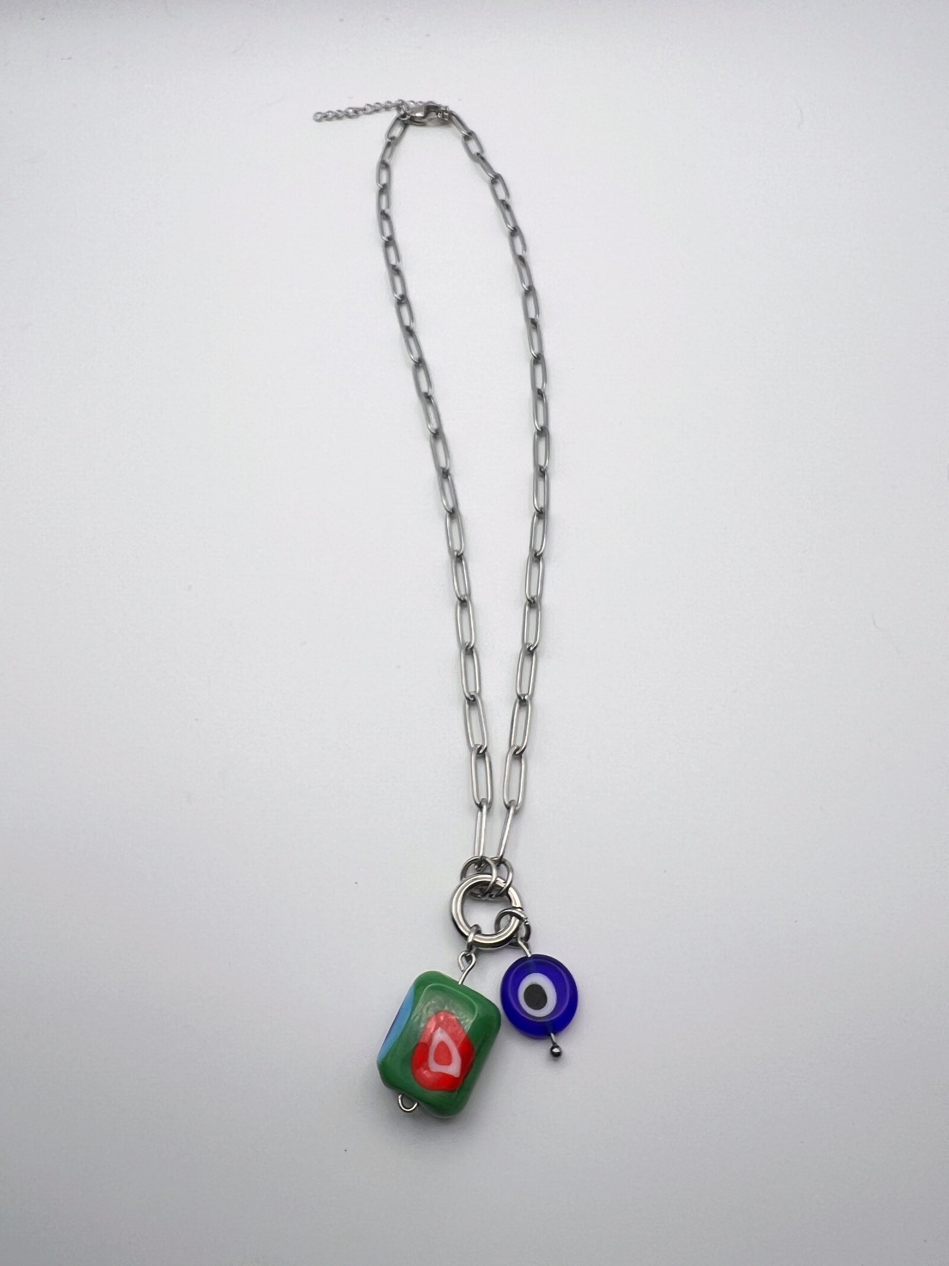 This 16" stainless steel chain with a 2'' extender features handcrafted beads sourced from Athens.