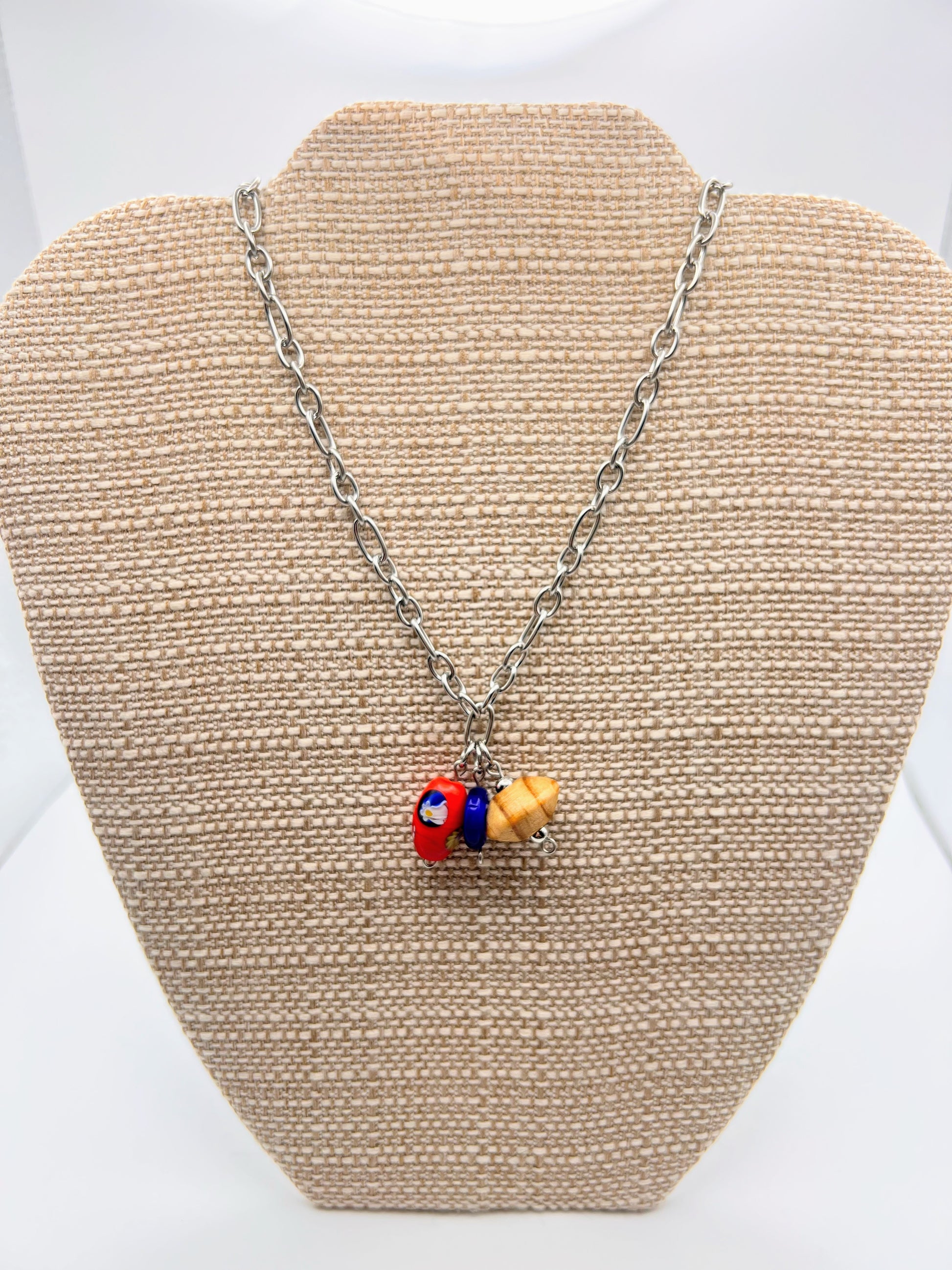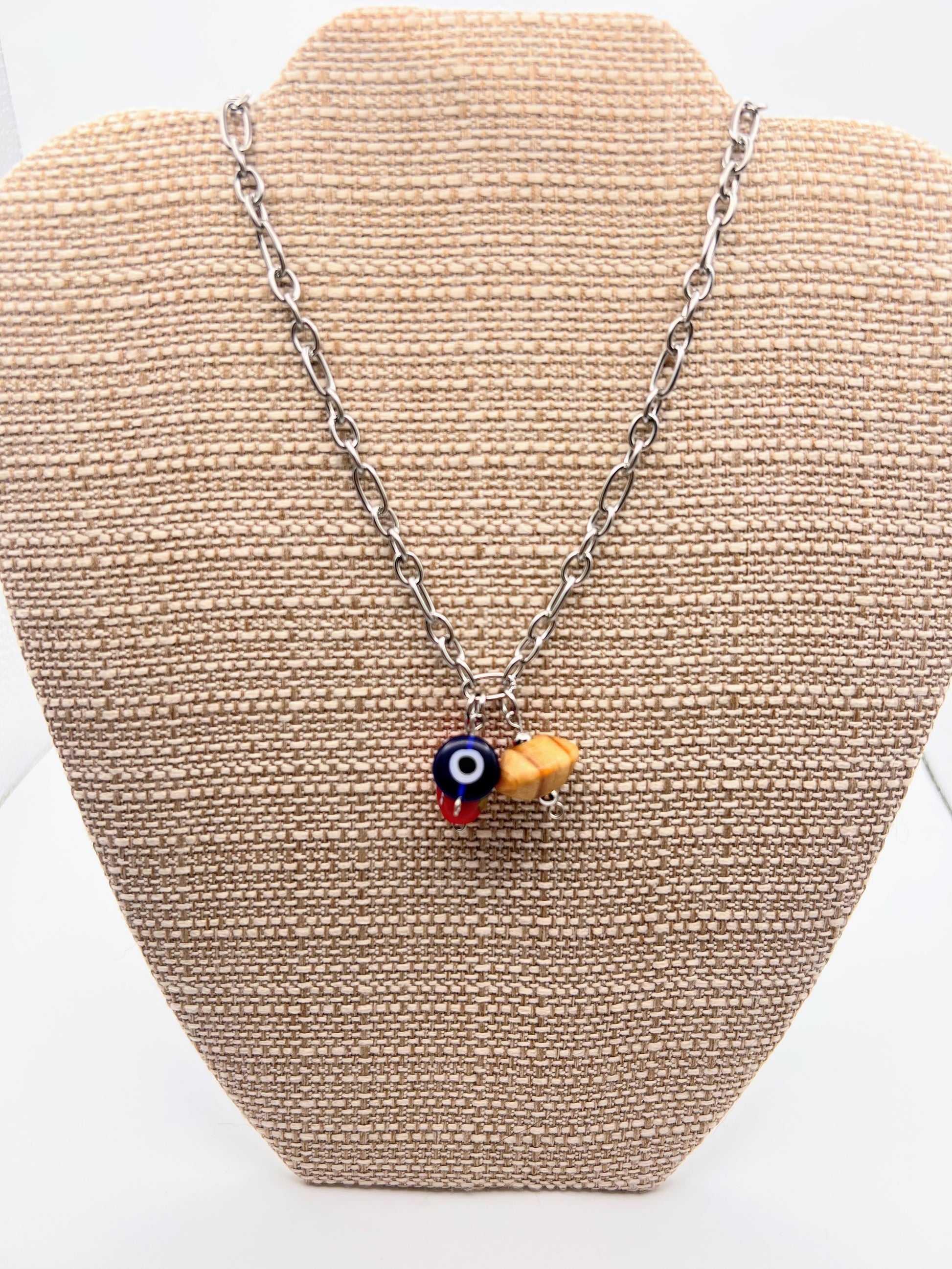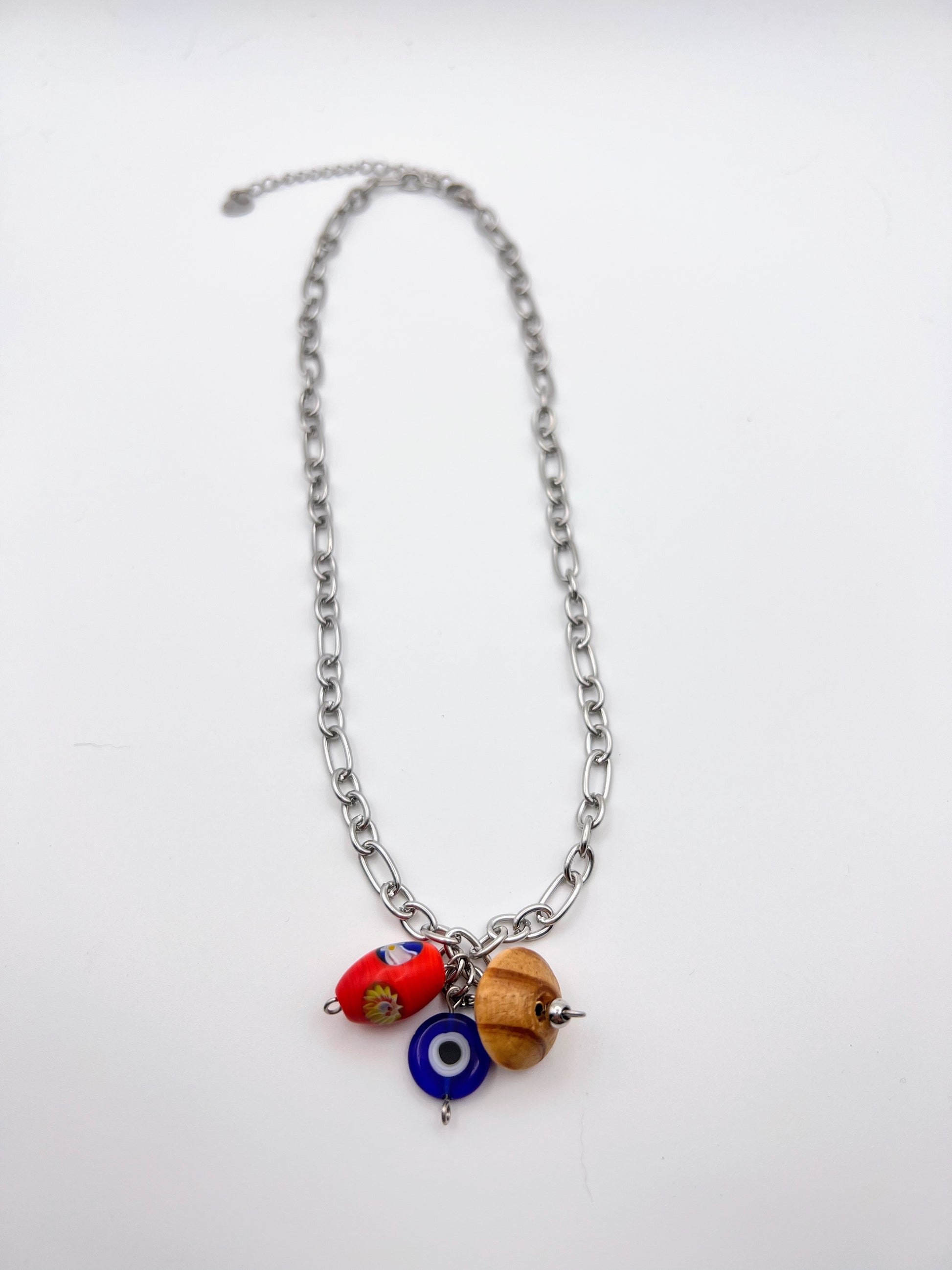 This 16" stainless steel chain with a 2'' extender features handcrafted beads sourced from Athens.