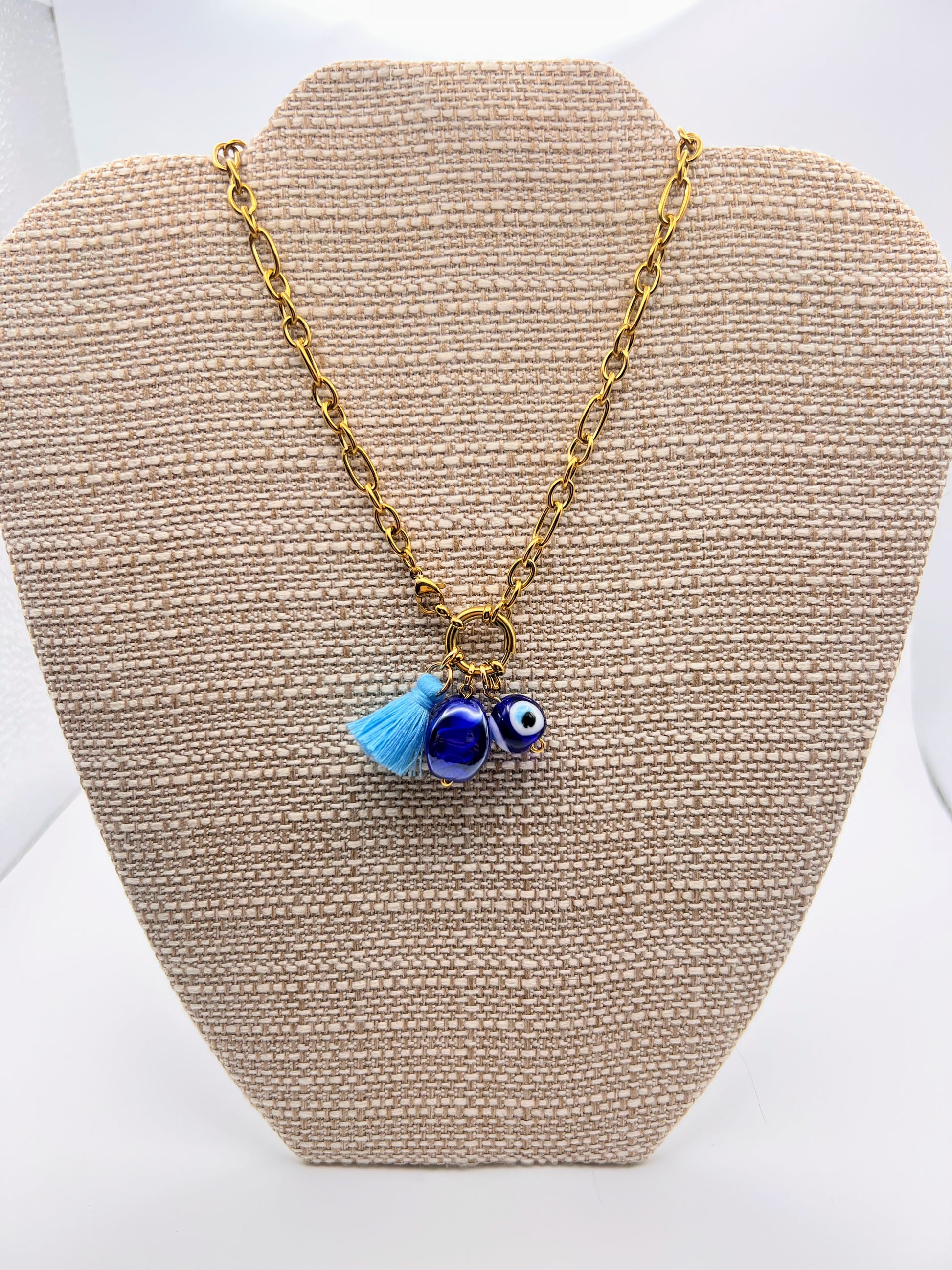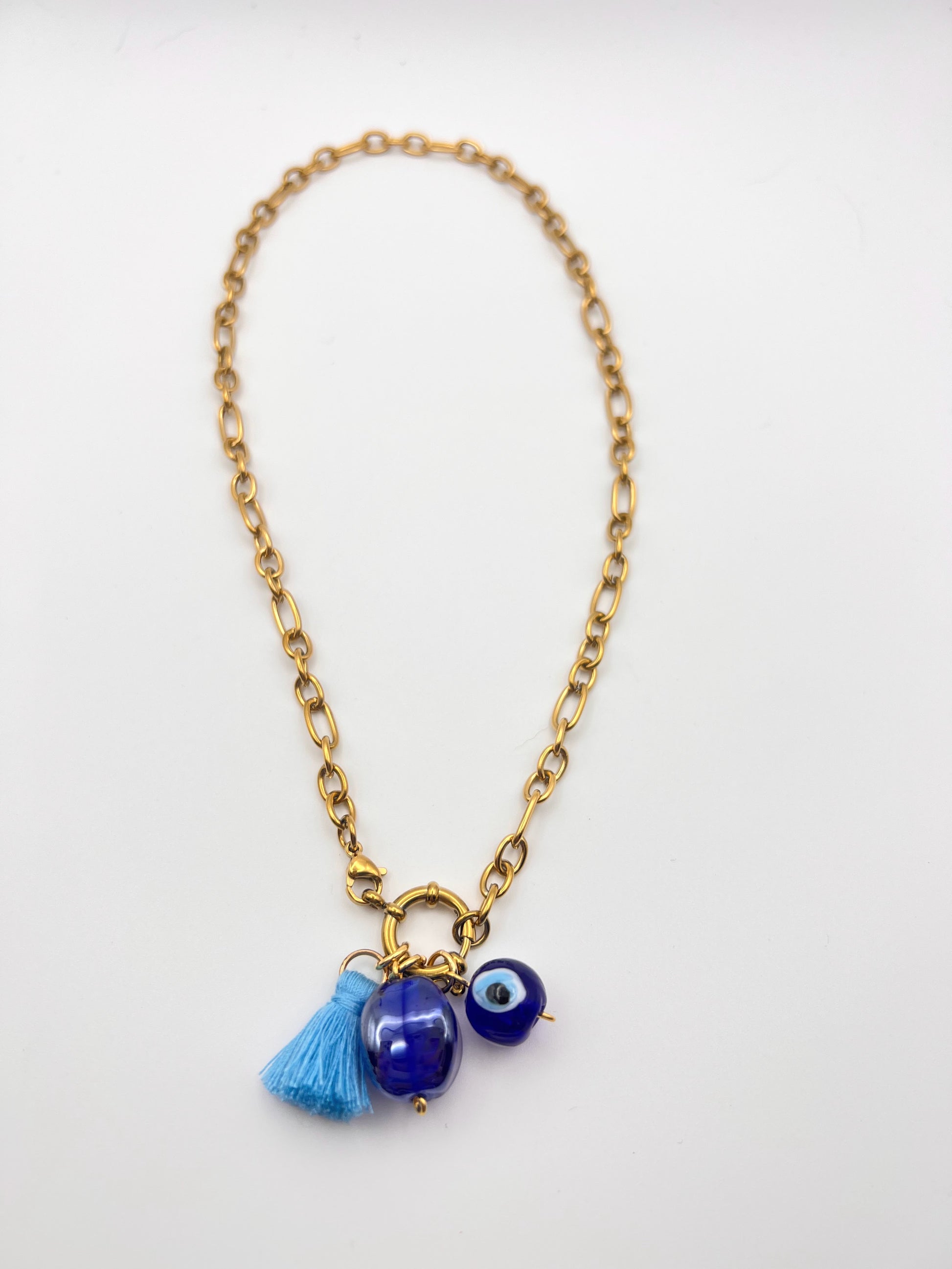 This 16" gold plated stainless steel chain features handcrafted beads sourced from Athens.